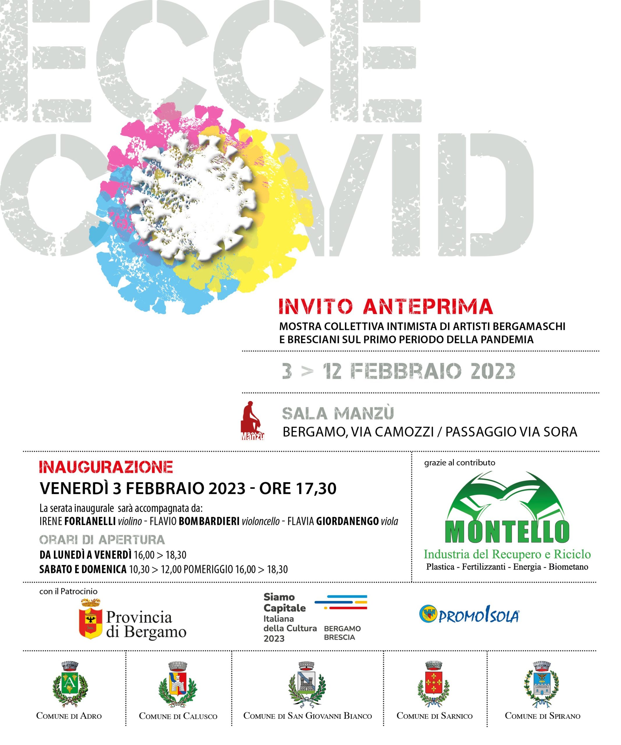 “Ecce Covid” è una mostra collettiva con trentadue artisti che daranno voce al loro sentire attraverso la scultura, la pittura e le recenti forme di espressione artistica. L’iniziativa è ideata da Elisabetta Longhi che si è occupata della curatela in collaborazione con l’”Associazione per Voi” il cui presidente è lo scultore Pierantonio Volpini, con la consulenza di Manuel Bonfanti. La mostra è dedicata al periodo più buio della pandemia, quando ancora non si sapeva come reagire a questa tragedia. L’ inizio di un flagello collettivo che ha toccato le radici di Bergamo e Brescia che, sconvolte dall’inatteso virus Covid 19, hanno dovuto far leva sulle loro capacità storiche di tenacia ed identità culturale, per un’ immediata reazione di sopravvivenza.